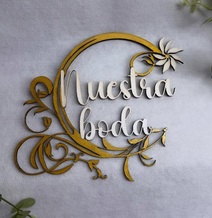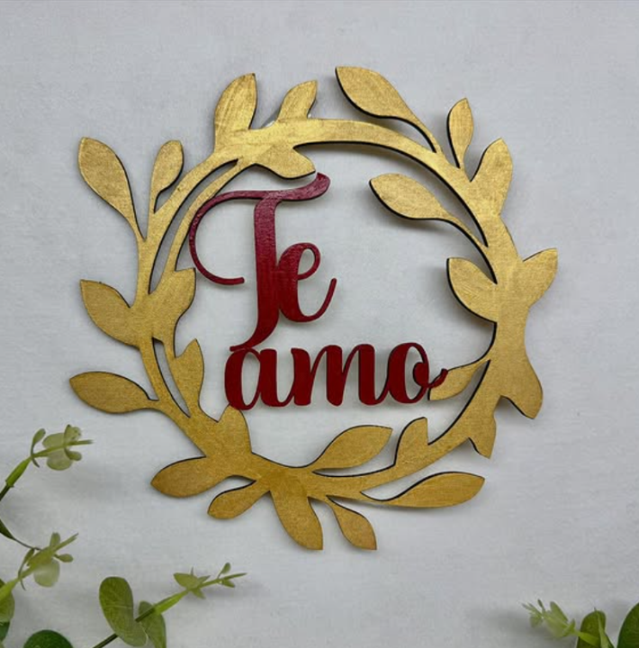 Guirnalda rústica hecha con MDF con forma de hojas color dorado con un mensaje corto al centro en color rojo
