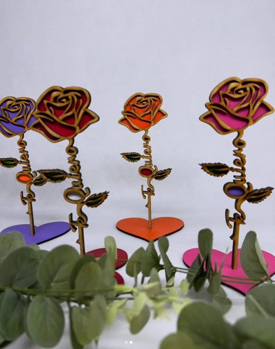 Rosas realizadas con MDF pintadas del color de su preferencia con un tallo delgado con la inscripción “Te Quiero” con el relleno de las letras en un tono de pintura distinto.