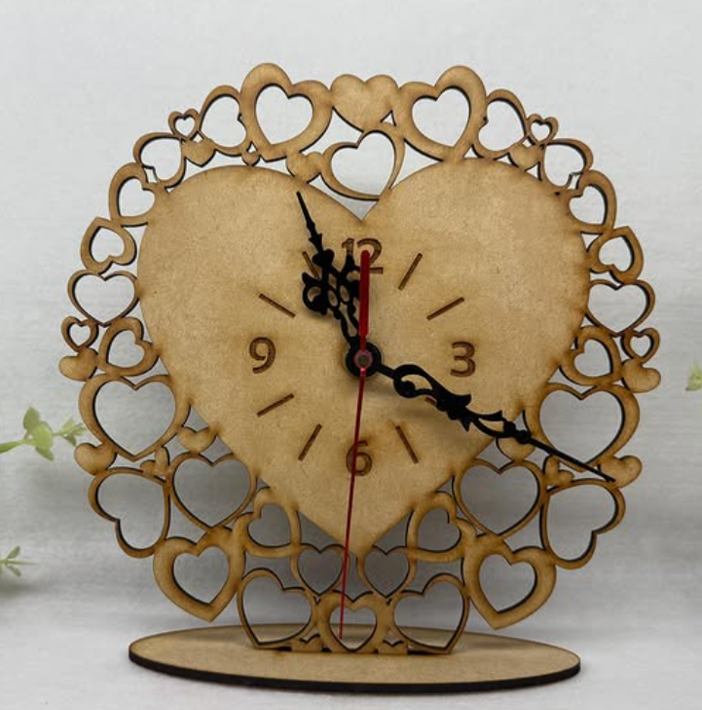 Reloj en forma de corazón rodeado de más corazones, cortado en MDF con posibilidad de ser pintado al color que se desee.